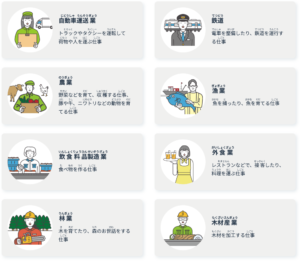 ・漁業: 漁具の製作・補修、水産動植物の採捕、漁獲物の処理・保蔵。